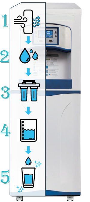 - L’eau créée traverse un système de filtration, filtres à charbon et membrane d’osmose, pour être fournie dans sa forme la plus pure.